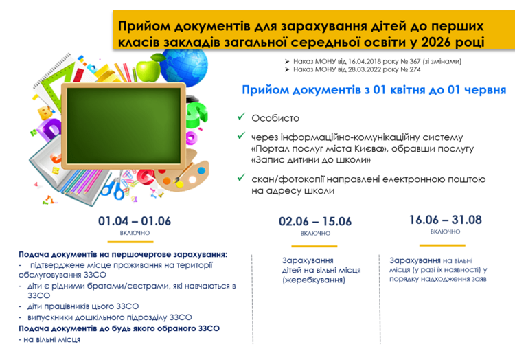 Із 1 квітня в Києві стартує прийом документів до перших класів на 2026/2027 навчальний рік. Подати заяви можна до 1 червня включно. Про це повідомив заступник голови КМДА Валентин Мондриївський.