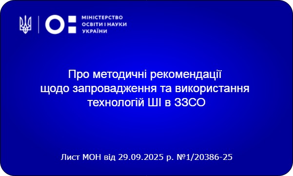 Міністерство освіти і науки України разом із Міністерством цифрової трансформації України розробили інструктивнометодичні рекомендації щодо запровадження та використання технологій штучного інтелекту в закладах загальної середньої освіти (додаються).