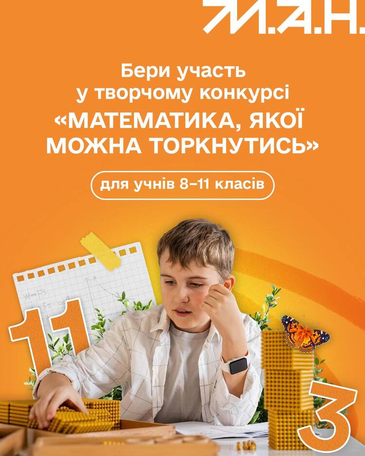 💡 Бачиш математику навколо? Покажи її іншим! Бери участь у всеукраїнському творчому конкурсі «Математика, яку можна торкнутись» у межах Всеукраїнського фізико-математичного місяця.