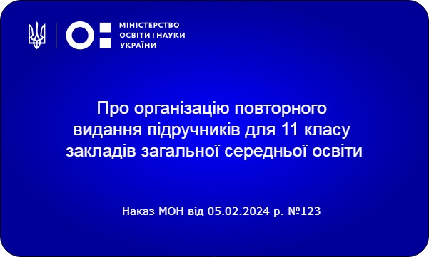 Наказом МОН України від 05.02.2024 № 123 «Про організацію повторного видання підручників для 11 класу закладів загальної середньої освіти» затверджено перелік підручників для 11 класу для повторного видання.